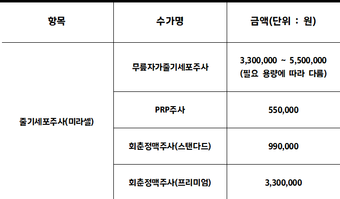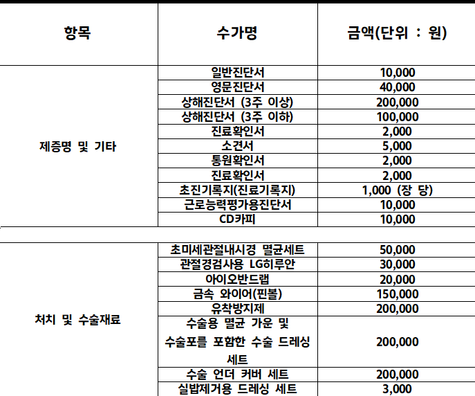 ※리파정형외과는 「의료법」 제 45조에 의거하여 비급여 항목 및 수수료 내역을 투명하게 공개합니다.(단위: 원) ※ 개인의 실손 적용 가능 여부에 대해서는 확인해 드리고 있지 않습니다.